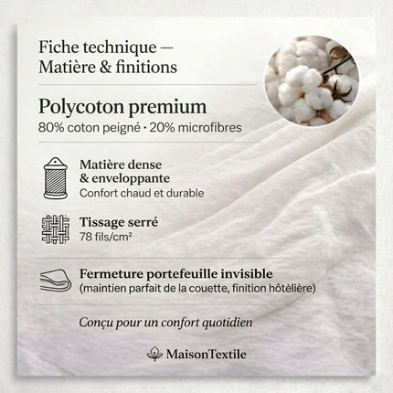 Le polycoton combine la douceur naturelle du coton à la souplesse des microfibres pour un confort adapté à toutes les saisons.