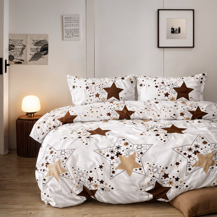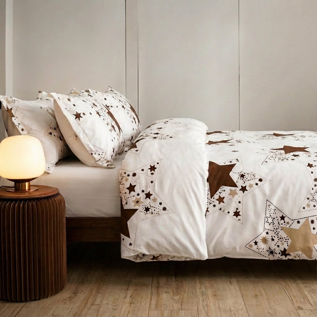 Această lenjerie de pat din poliester-cotton întărit include o husa de plapumă și două fețe de pernă asortate, imprimate cu motivi grafici inspirați dintr-un stil urban și contemporan. Țesătura, atât moale cât și robustă, asigură o utilizare confortabilă și durabilă.